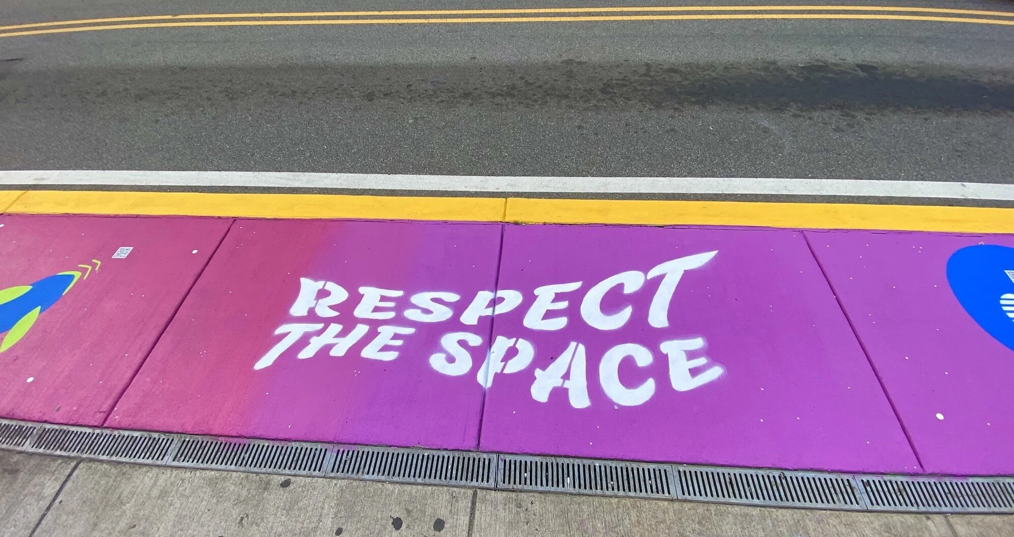 Her concept for the piece expanded upon previous pandemic artwork, creating playful, but informative, messaging in a galaxy theme: respect the space. The overall message was relayed with 3M planet-cut outs, hand-painted stars and stenciled moon boots to mark suggested standing spots.